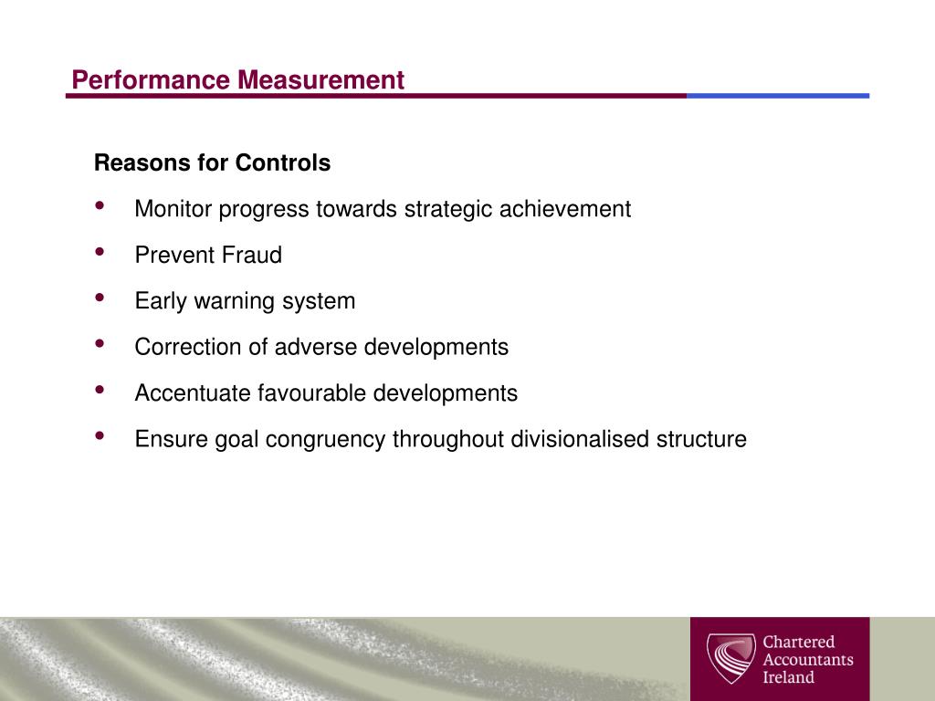 Performance Measurement Reasons for Controls • Monitor progress towards strategic achievement • Prevent Fraud • Early warning system • Correction of adverse developments • Accentuate favourable developments • Ensure goal congruency throughout divisionalised structure
