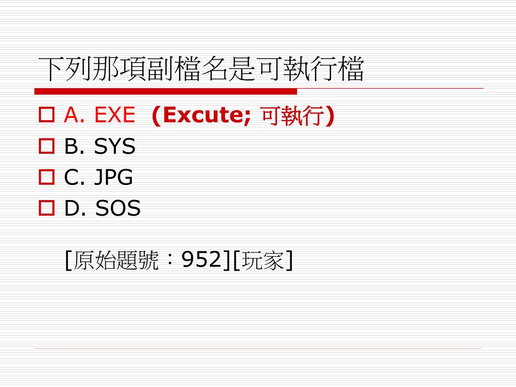 下列那項副檔名是可執行檔 • A. EXE (Excute; 可執行) • B. SYS • C. JPG • D. SOS[原始題號:952][玩家]