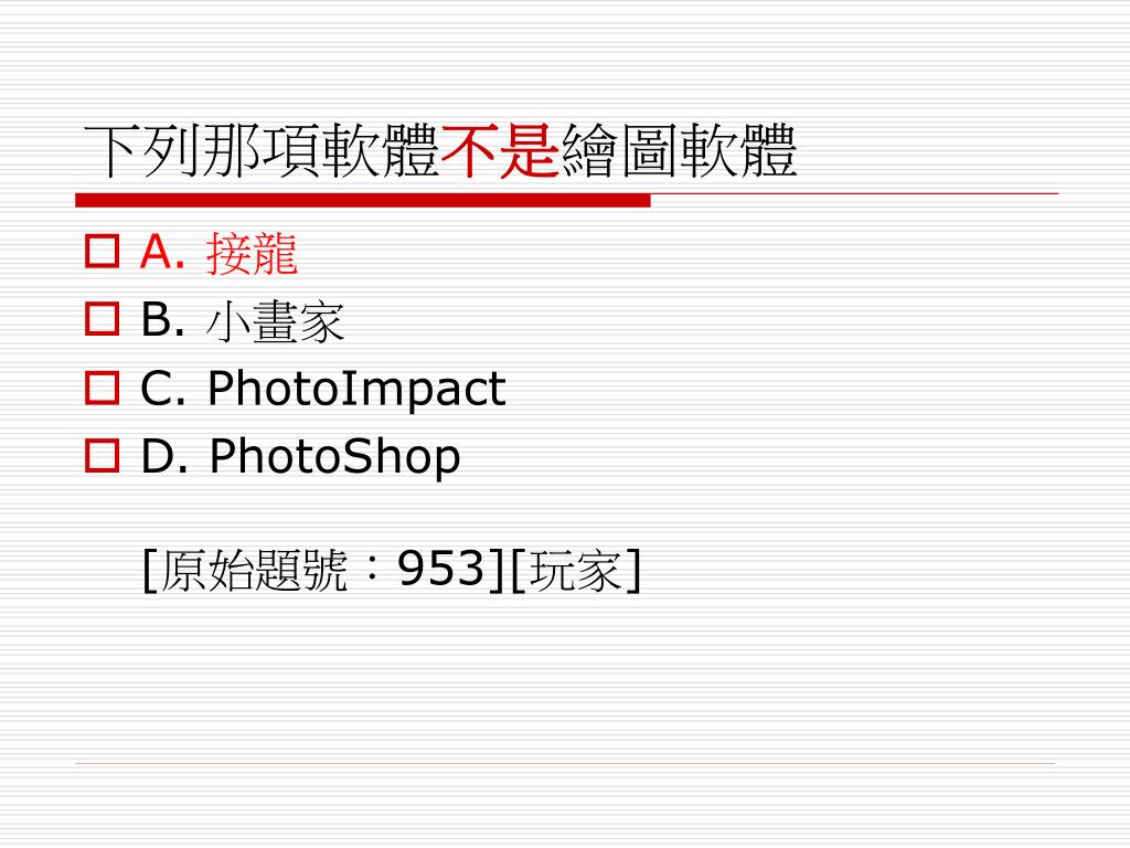 下列那項軟體不是繪圖軟體 • A. 接龍 • B. 小畫家 • C. PhotoImpact • D. PhotoShop[原始題號:953][玩家]