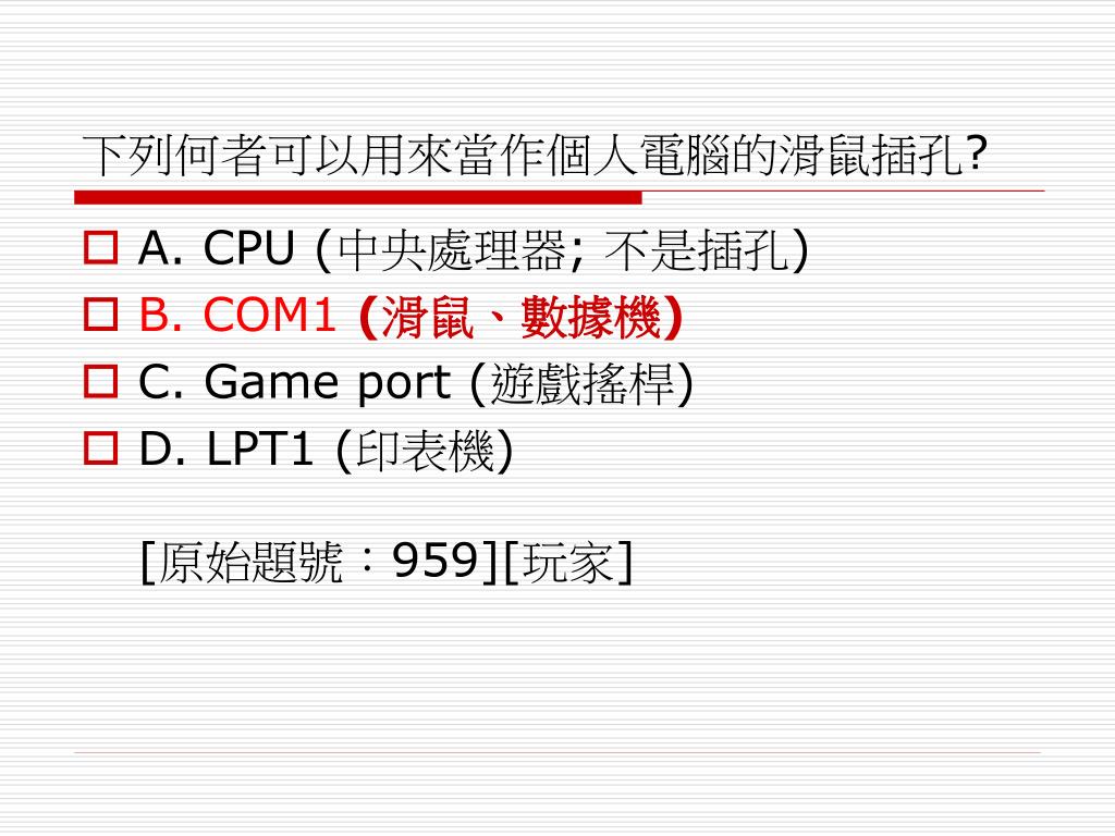 下列何者可以用來當作個人電腦的滑鼠插孔? • A. CPU (中央處理器; 不是插孔) • B. COM1 (滑鼠、數據機) • C. Game port (遊戲搖桿) • D. LPT1 (印表機)[原始題號:959][玩家]
