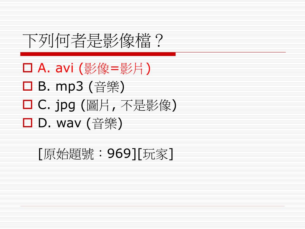 下列何者是影像檔? • A. avi (影像=影片) • B. mp3 (音樂) • C. jpg (圖片, 不是影像) • D. wav (音樂)[原始題號:969][玩家]