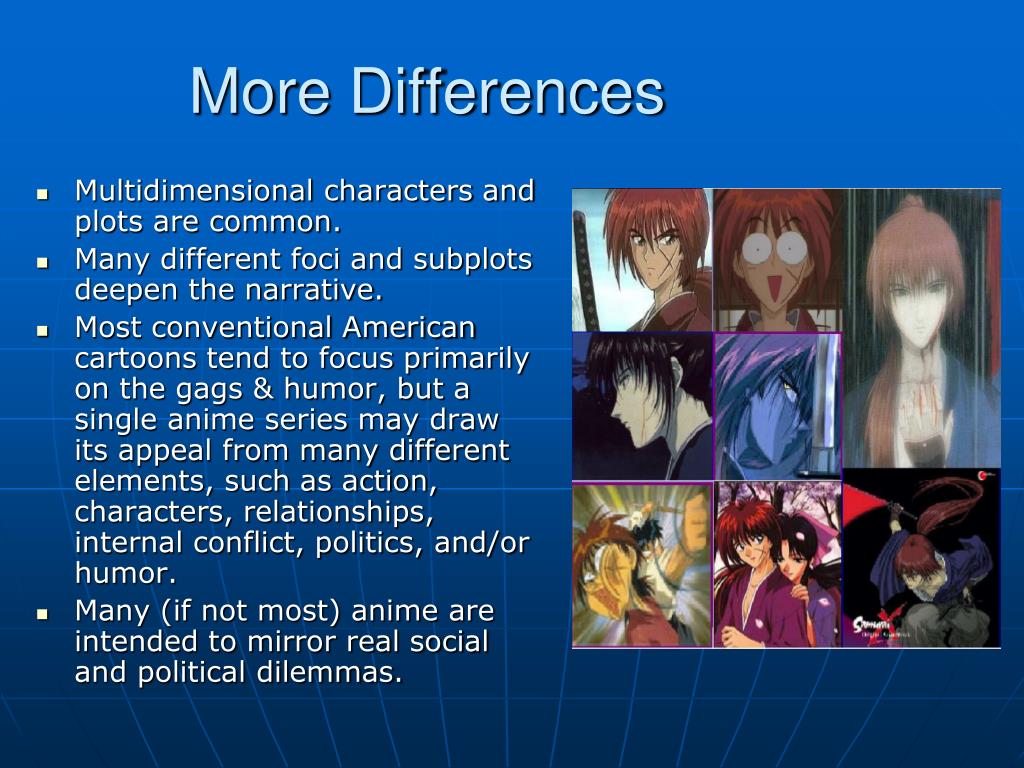 More Differences • Multidimensional characters and plots are common. • Many different foci and subplots deepen the narrative. • Most conventional American cartoons tend to focus primarily on the gags & humor, but a single anime series may draw its appeal from many different elements, such as action, characters, relationships, internal conflict, politics, and/or humor. • Many (if not most) anime are intended to mirror real social and political dilemmas.