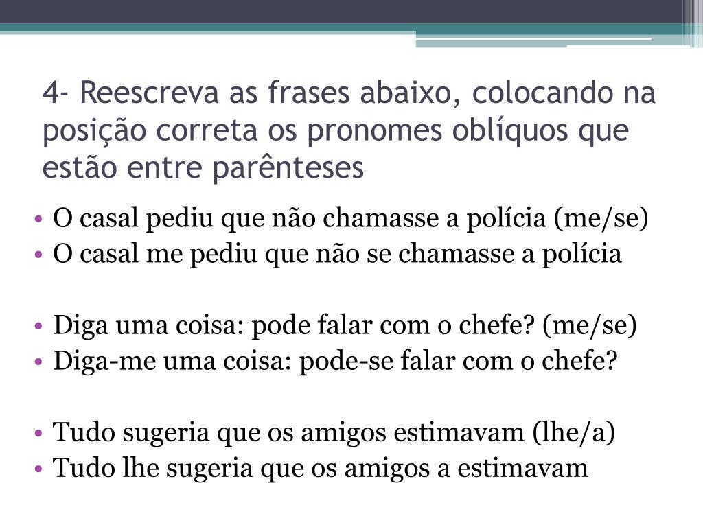 4- Reescreva as frases abaixo, colocando na posição correta os pronomes oblíquos que estão entre parênteses • O casal pediu que não chamasse a polícia (me/se) • O casal me pediu que não se chamasse a polícia • Diga uma coisa: pode falar com o chefe? (me/se) • Diga-me uma coisa: pode-se falar com o chefe? • Tudo sugeria que os amigos estimavam (lhe/a) • Tudo lhe sugeria que os amigos a estimavam