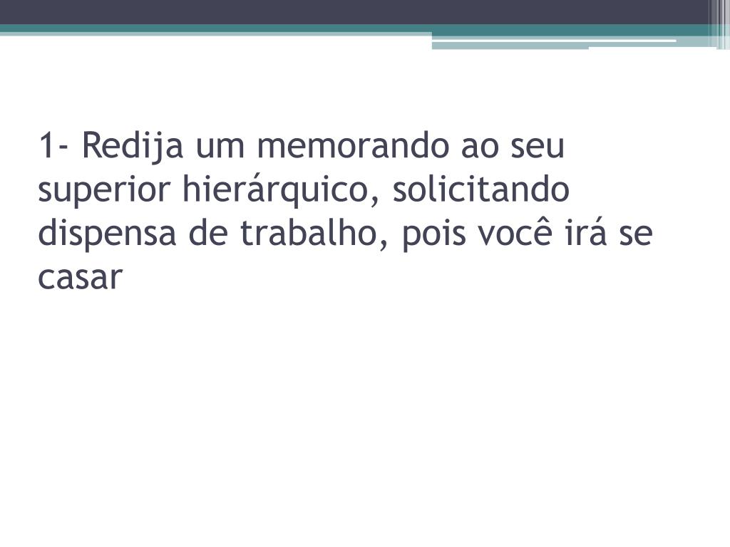 1- Redija um memorando ao seu superior hierárquico, solicitando dispensa de trabalho, pois você irá se casar