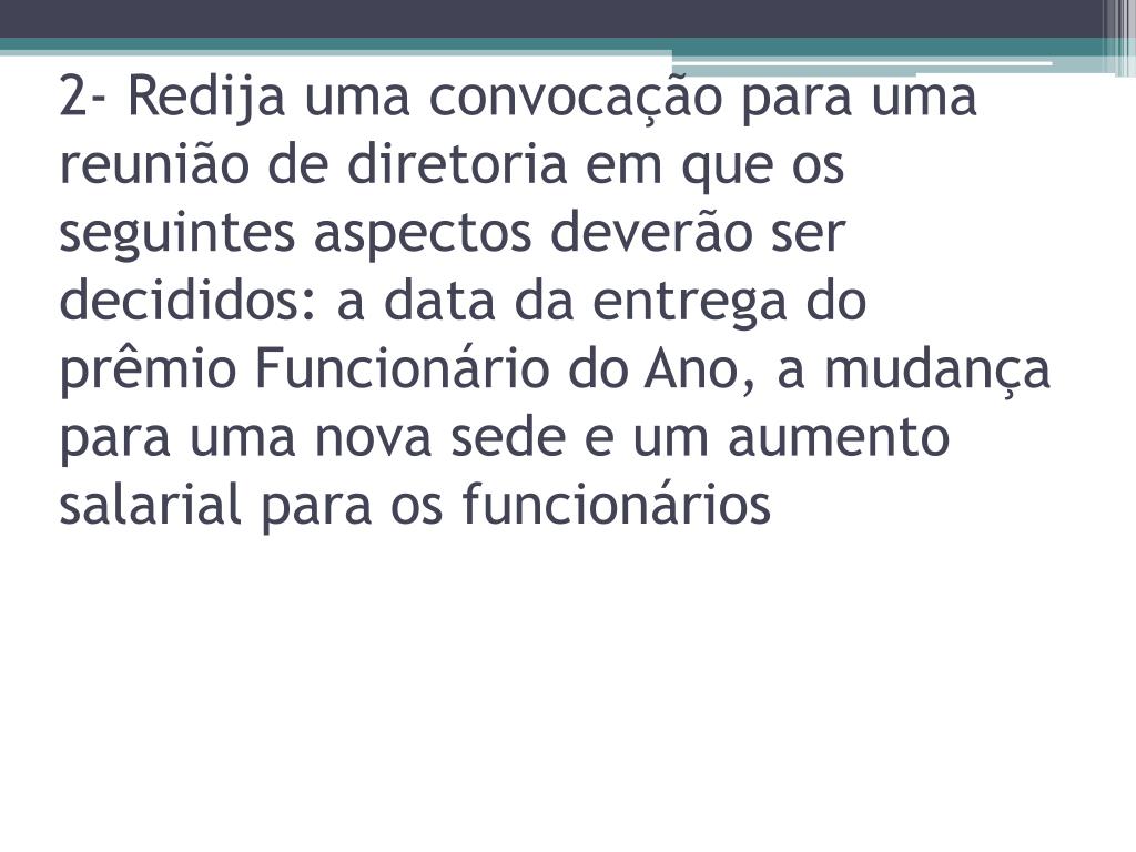 2- Redija uma convocação para uma reunião de diretoria em que os seguintes aspectos deverão ser decididos: a data da entrega do prêmio Funcionário do Ano, a mudança para uma nova sede e um aumento salarial para os funcionários