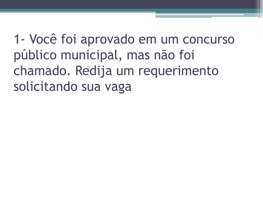 1- Você foi aprovado em um concurso público municipal, mas não foi chamado. Redija um requerimento solicitando sua vaga