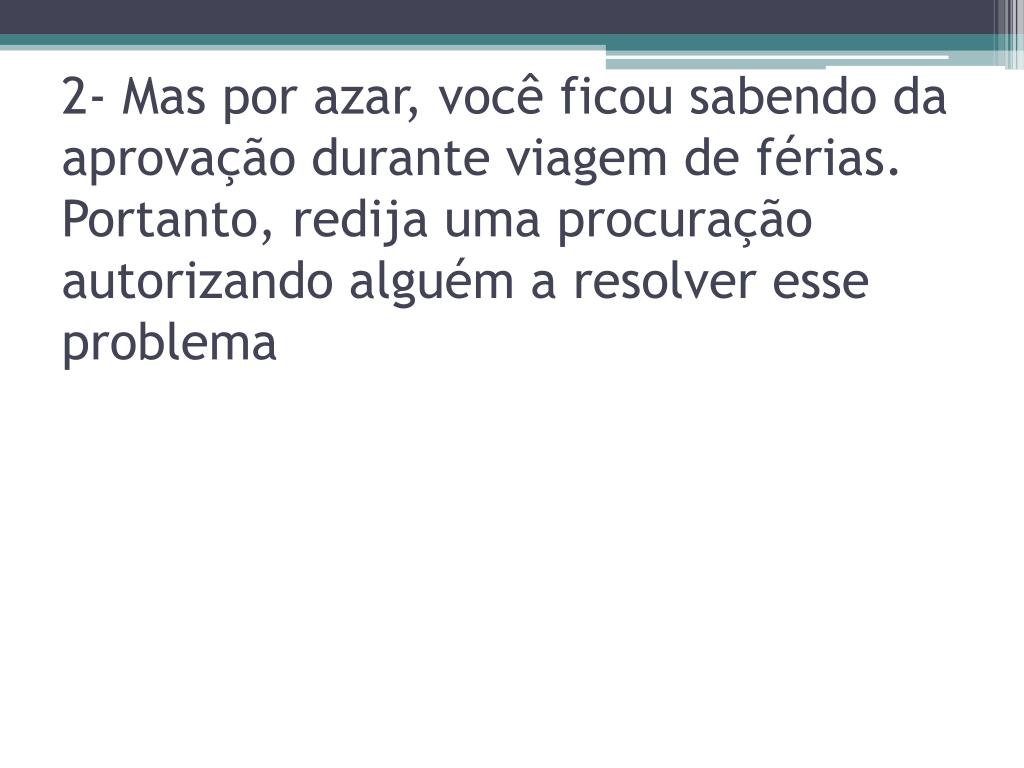 2- Mas por azar, você ficou sabendo da aprovação durante viagem de férias. Portanto, redija uma procuração autorizando alguém a resolver esse problema