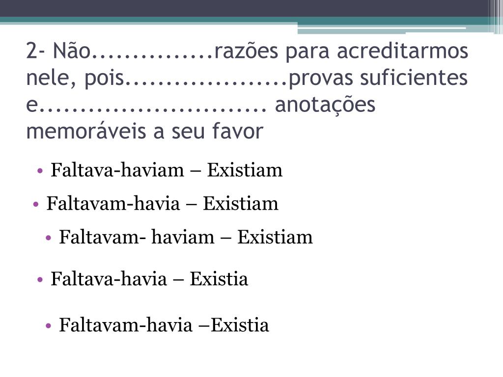 2- Não...............razões para acreditarmos nele, pois....................provas suficientes e............................ anotações memoráveis a seu favor • Faltava-haviam – Existiam • Faltavam-havia – Existiam • Faltavam- haviam – Existiam • Faltava-havia – Existia • Faltavam-havia –Existia