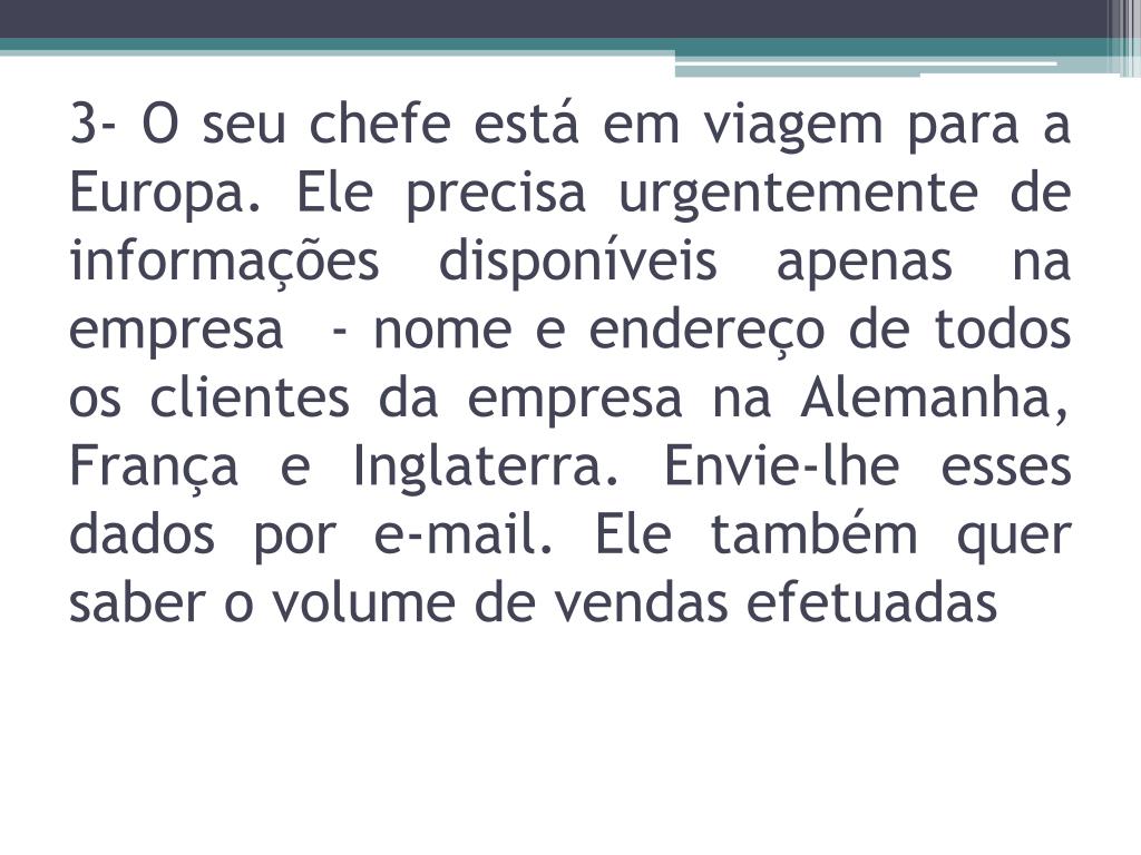 3- O seu chefe está em viagem para a Europa. Ele precisa urgentemente de informações disponíveis apenas na empresa - nome e endereço de todos os clientes da empresa na Alemanha, França e Inglaterra. Envie-lhe esses dados por e-mail. Ele também quer saber o volume de vendas efetuadas