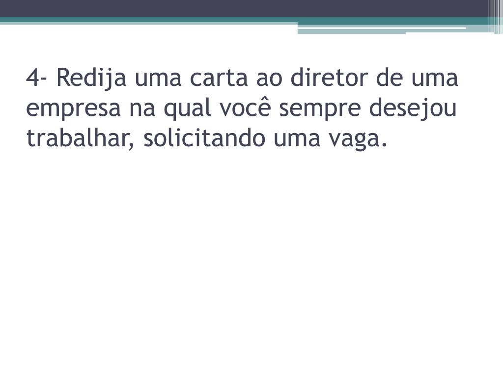4- Redija uma carta ao diretor de uma empresa na qual você sempre desejou trabalhar, solicitando uma vaga.