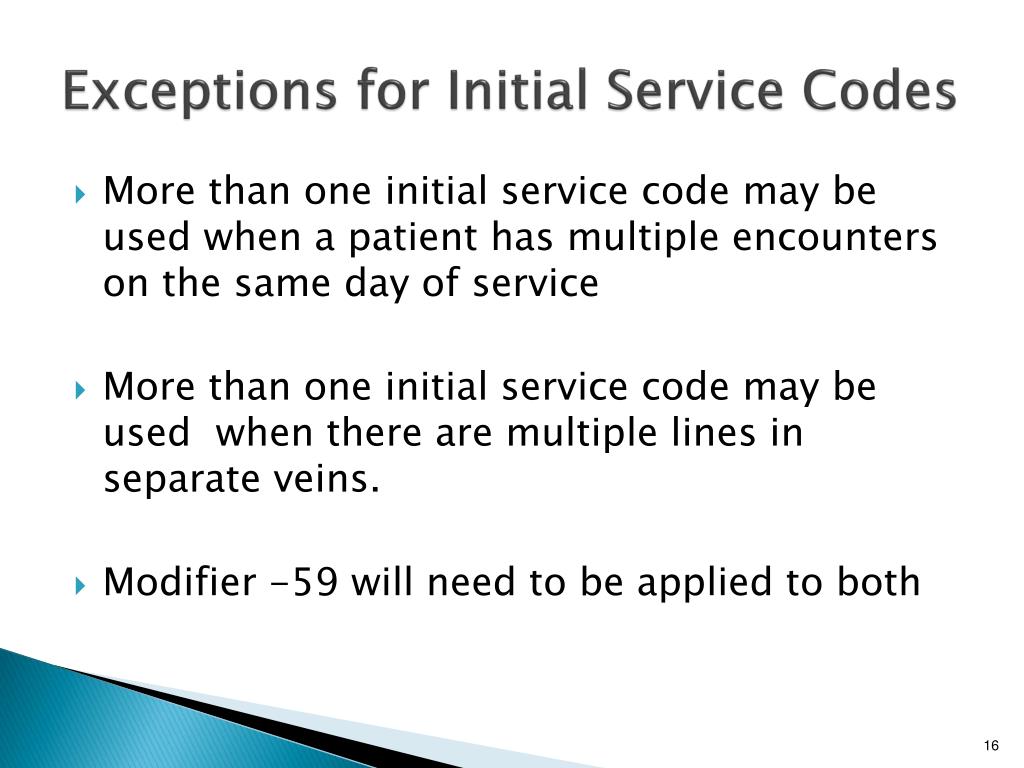Exceptions for Initial Service Codes • More than one initial service code may be used when a patient has multiple encounters on the same day of service • More than one initial service code may be used when there are multiple lines in separate veins. • Modifier -59 will need to be applied to both
