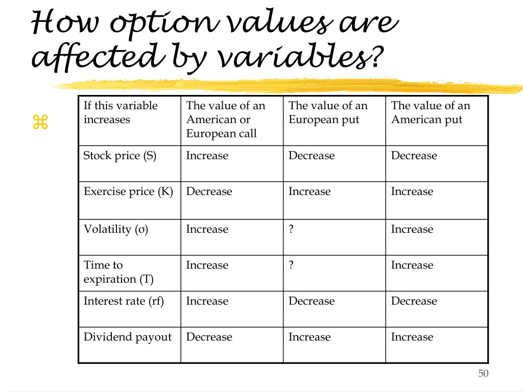 Valuation of options • An American call's (put's) value can never exceed the value of the stock (strike price) • Why? • Does this principle hold for European options? • Yes.