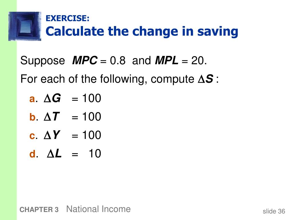 EXERCISE: Calculate the change in saving Suppose MPC = 0.8 and MPL = 20. For each of the following, compute S : a. G = 100 b. T = 100 c. Y = 100 d. L = 10 CHAPTER 3 National Income