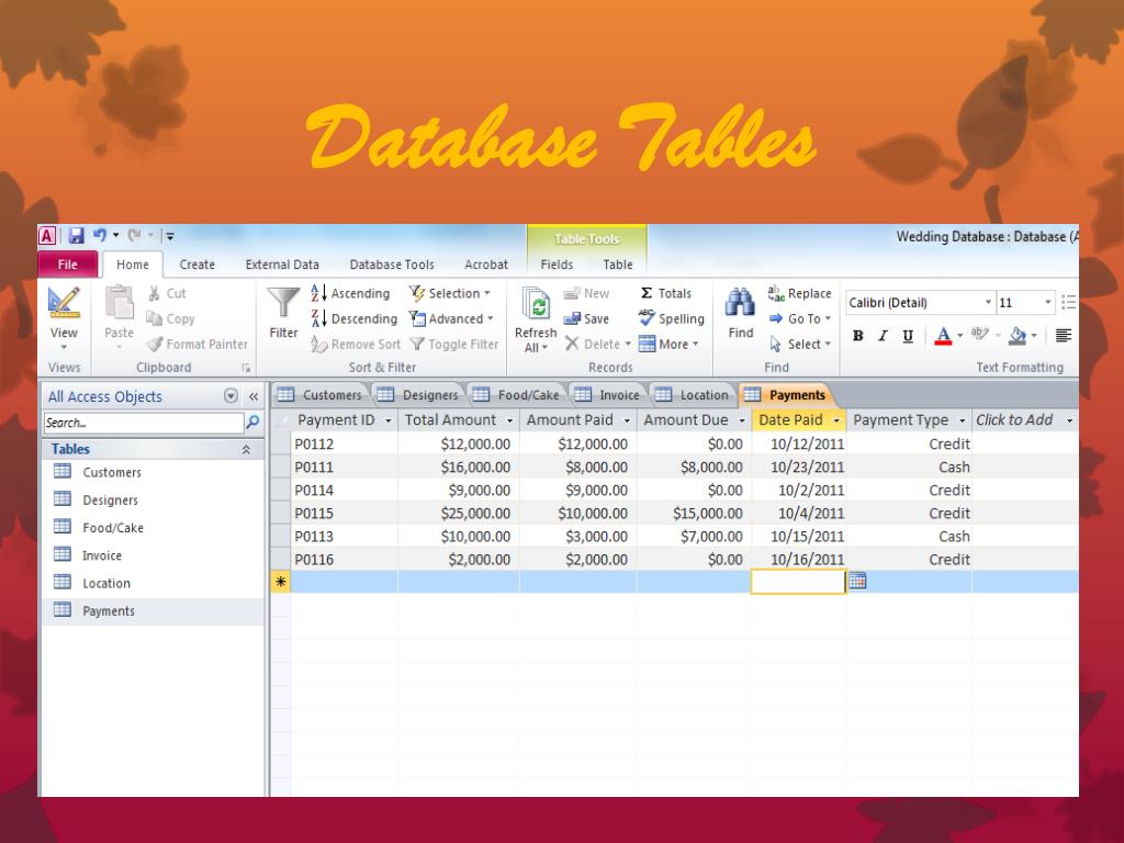 Physical Design Customer (Customer Id, LastName, FirstName, Address, Contact #) Event(Event Id, Floral Package #, Food/Cake, Food Type, Date) Location(Location Id, Address, City) Invoice (Invoice Id, Invoice Amount, Date, Paid) Payments (Payment Id, Total Amount, Amount Paid, Amount Due, Date Paid, PaymentType)