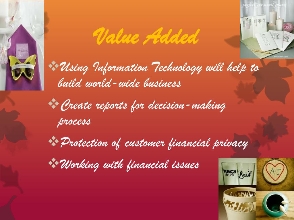 Value Added • Using Information Technology will help to build world-wide business • Create reports for decision-making process • Protection of customer financial privacy • Working with financial issues