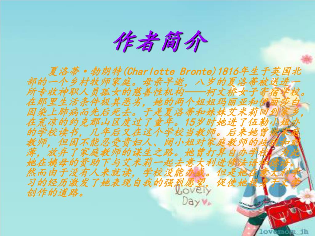 作者简介 夏洛蒂·勃朗特(Charlotte Bronte)1816年生于英国北部的一个乡村牧师家庭。母亲早逝,八岁的夏洛蒂被送进一所专收神职人员孤女的慈善性机构——柯文桥女子寄宿学校。在那里生活条件极其恶劣,她的两个姐姐玛丽亚和伊丽莎白因染上肺病而先后死去。于是夏洛蒂和妹妹艾米莉回到家乡,在荒凉的约克郡山区度过了童年。15岁时她进了伍勒小姐办的学校读书,几年后又在这个学校当教师。后来她曾做家庭教师,但因不能忍受贵妇人、阔小姐对家庭教师的歧视和刻薄,放弃了家庭教师的谋生之路。她曾打算自办学校,为此她在姨母的资助下与艾米莉一起去意大利进修法语和德语。然而由于没有人来就读,学校没能办成。但是她在意大利学习的经历激发了她表现自我的强烈愿望,促使她投身于文学创作的道路。