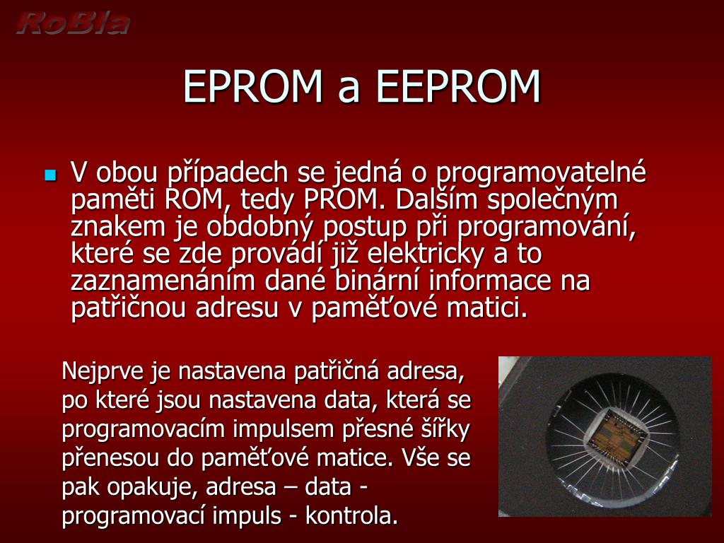 EPROM a EEPROM • V obou případech se jedná o programovatelné paměti ROM, tedy PROM. Dalším společným znakem je obdobný postup při programování, které se zde provádí již elektricky a to zaznamenáním dané binární informace na patřičnou adresu v paměťové matici. Nejprve je nastavena patřičná adresa, po které jsou nastavena data, která se programovacím impulsem přesné šířky přenesou do paměťové matice. Vše se pak opakuje, adresa – data - programovací impuls - kontrola.