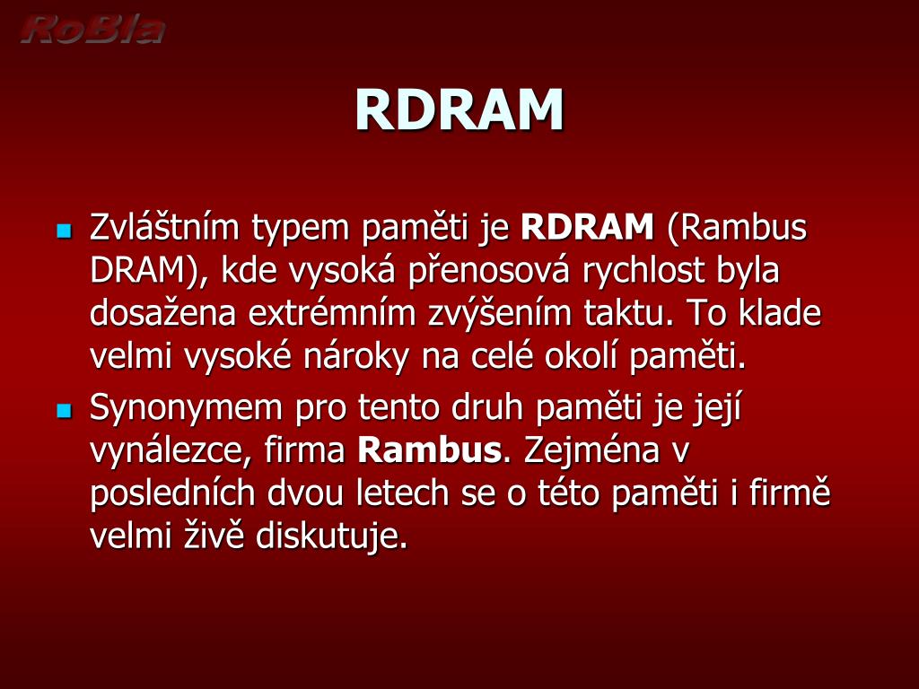 RDRAM • Zvláštním typem paměti je RDRAM (Rambus DRAM), kde vysoká přenosová rychlost byla dosažena extrémním zvýšením taktu. To klade velmi vysoké nároky na celé okolí paměti. • Synonymem pro tento druh paměti je její vynálezce, firma Rambus. Zejména v posledních dvou letech se o této paměti i firmě velmi živě diskutuje.