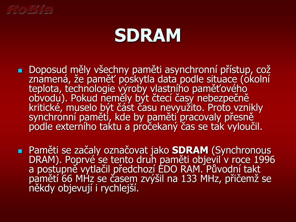 SDRAM • Doposud měly všechny paměti asynchronní přístup, což znamená, že paměť poskytla data podle situace (okolní teplota, technologie výroby vlastního paměťového obvodu). Pokud neměly být čtecí časy nebezpečně kritické, muselo být část času nevyužito. Proto vznikly synchronní paměti, kde by paměti pracovaly přesně podle externího taktu a pročekaný čas se tak vyloučil. • Paměti se začaly označovat jako SDRAM (Synchronous DRAM). Poprvé se tento druh paměti objevil v roce 1996 a postupně vytlačil předchozí EDO RAM. Původní takt pamětí 66 MHz se časem zvýšil na 133 MHz, přičemž se někdy objevují i rychlejší.