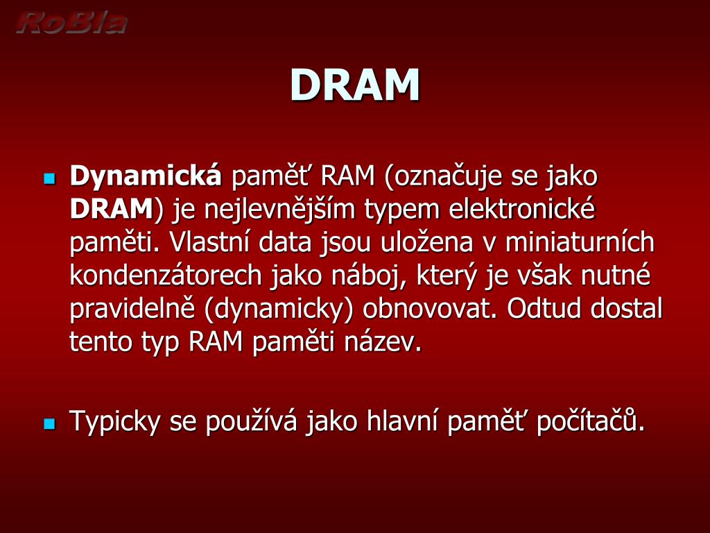 DRAM • Dynamická paměť RAM (označuje se jako DRAM) je nejlevnějším typem elektronické paměti. Vlastní data jsou uložena v miniaturních kondenzátorech jako náboj, který je však nutné pravidelně (dynamicky) obnovovat. Odtud dostal tento typ RAM paměti název. • Typicky se používá jako hlavní paměť počítačů.