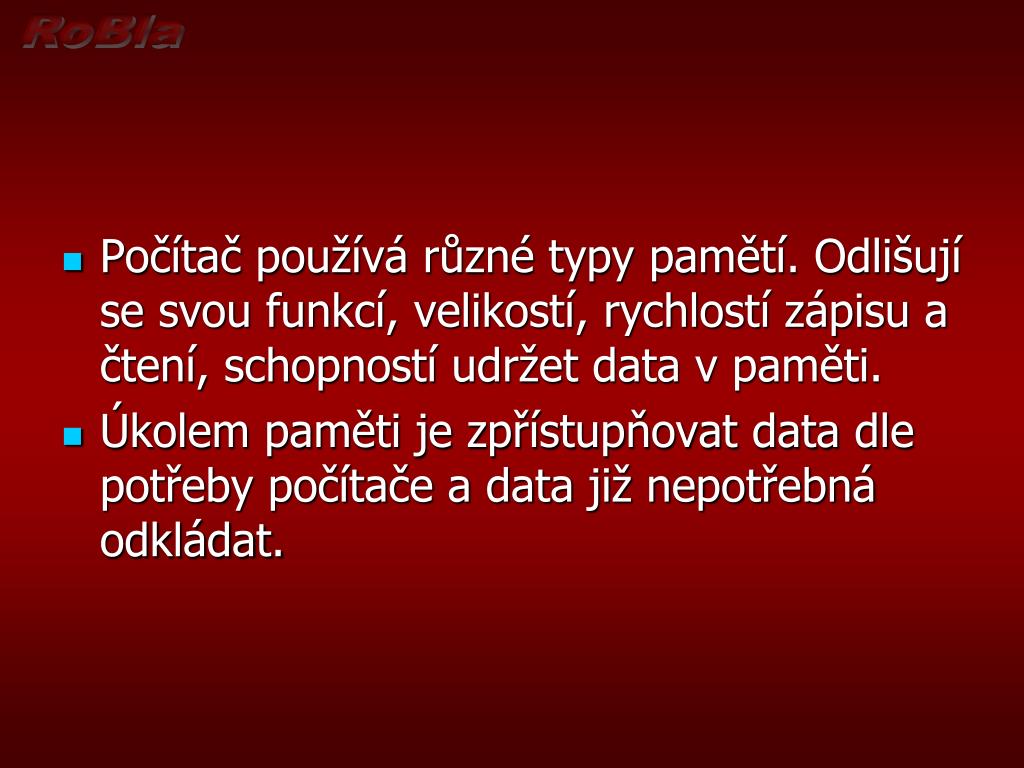Počítač používá různé typy pamětí. Odlišují se svou funkcí, velikostí, rychlostí zápisu a čtení, schopností udržet data v paměti. • Úkolem paměti je zpřístupňovat data dle potřeby počítače a data již nepotřebná odkládat.