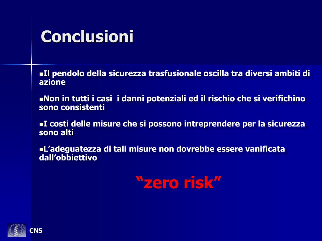 CNS Conclusioni • Il pendolodellasicurezzatrasfusionaleoscillatradiversiambitidiazione • Non in tuttiicasiidannipotenzialiedilrischiochesiverifichinosonoconsistenti • I costidellemisurechesipossonointreprendere per la sicurezzasonoalti • L’adeguatezzaditalimisure non dovrebbeesserevanificatadall’obbiettivo “zero risk”