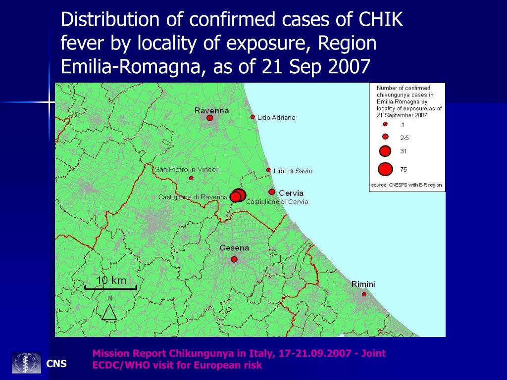 CNS Distribution of confirmed cases of CHIK fever by locality of exposure, Region Emilia-Romagna, as of 21 Sep 2007 Mission Report Chikungunya in Italy, 17-21.09.2007 - Joint ECDC/WHO visit for European risk