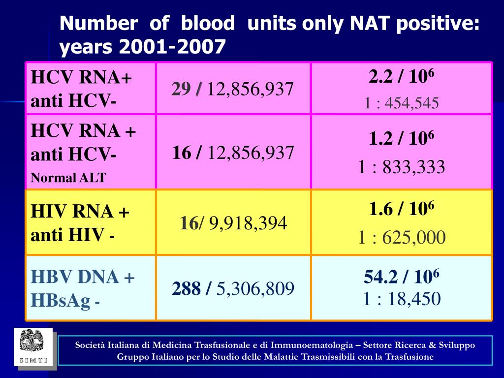 HCV RNA+ anti HCV- 29 / 12,856,937 2.2 / 106 1 : 454,545 HCV RNA + anti HCV- Normal ALT 16 / 12,856,937 1.2 / 106 1 : 833,333 HIV RNA + anti HIV - 16/ 9,918,394 1.6 / 106 1 : 625,000 HBV DNA + HBsAg - 288 / 5,306,809 54.2 / 106 1 : 18,450 Number of blood units only NAT positive: years 2001-2007 Società Italiana di Medicina Trasfusionale e di Immunoematologia – Settore Ricerca & Sviluppo Gruppo Italiano per lo Studio delle Malattie Trasmissibili con la Trasfusione