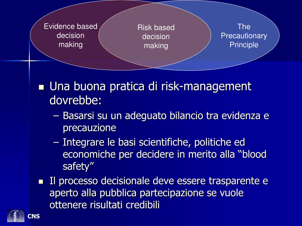 Evidence based decision making The Precautionary Principle CNS Risk based decision making • Unabuonapraticadi risk-management dovrebbe: • Basarsisu un adeguatobilanciotraevidenza e precauzione • Integrare le basiscientifiche, politicheedeconomiche per decidere in meritoalla “blood safety” • Il processodecisionaledeveesseretrasparente e apertoallapubblicapartecipazione se vuoleottenererisultaticredibili