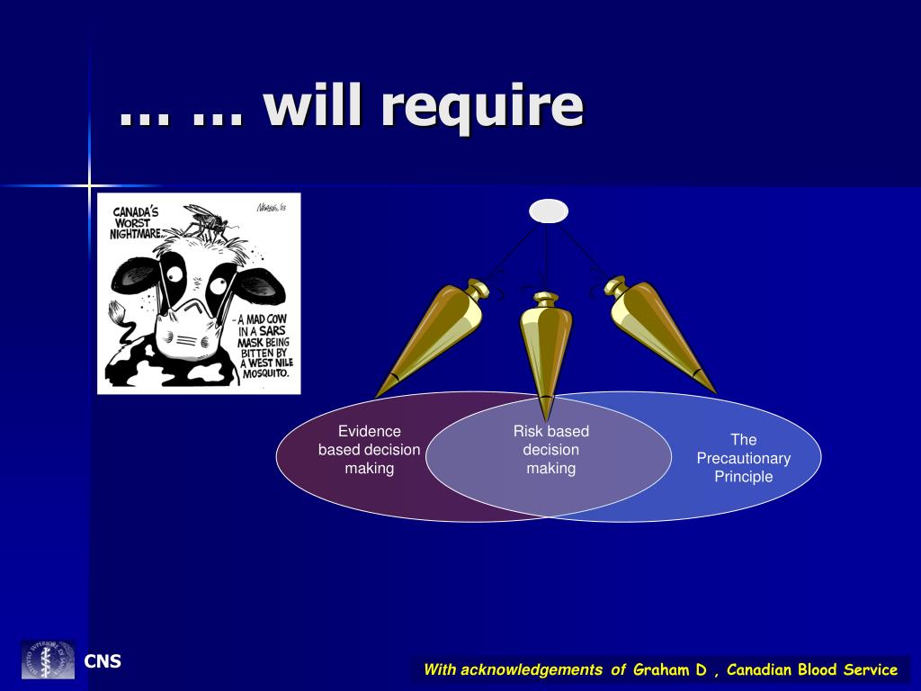 Evidence based decision making Risk based decision making The Precautionary Principle CNS … … will require With acknowledgements of Graham D , Canadian Blood Service
