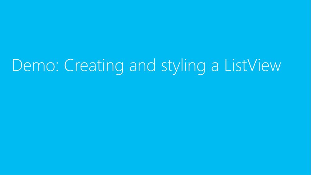 Recap: Creating and styling a ListView • Populate a data source with your items • Binding list for most ListViews • Virtualized data source for very large data sets. • Design the layout for your items with a template • HTML binding templates for most ListViews • JavaScript function templates for complex rendering • Use CSS to style your ListView and Items.