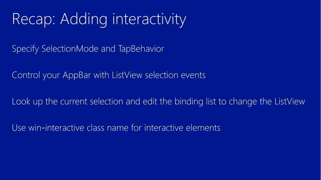 Recap: Adding interactivity • Specify SelectionMode and TapBehavior • Control your AppBar with ListView selection events • Look up the current selection and edit the binding list to change the ListView • Use win-interactive class name for interactive elements