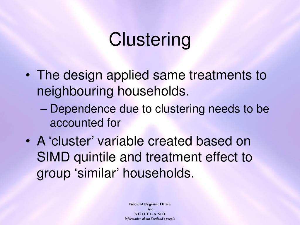 Clustering • The design applied same treatments to neighbouring households. • Dependence due to clustering needs to be accounted for • A ‘cluster’ variable created based on SIMD quintile and treatment effect to group ‘similar’ households.