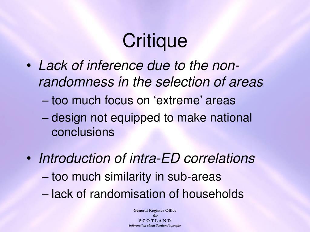 Critique • Lack of inference due to the non-randomness in the selection of areas • too much focus on ‘extreme’ areas • design not equipped to make national conclusions • Introduction of intra-ED correlations • too much similarity in sub-areas • lack of randomisation of households