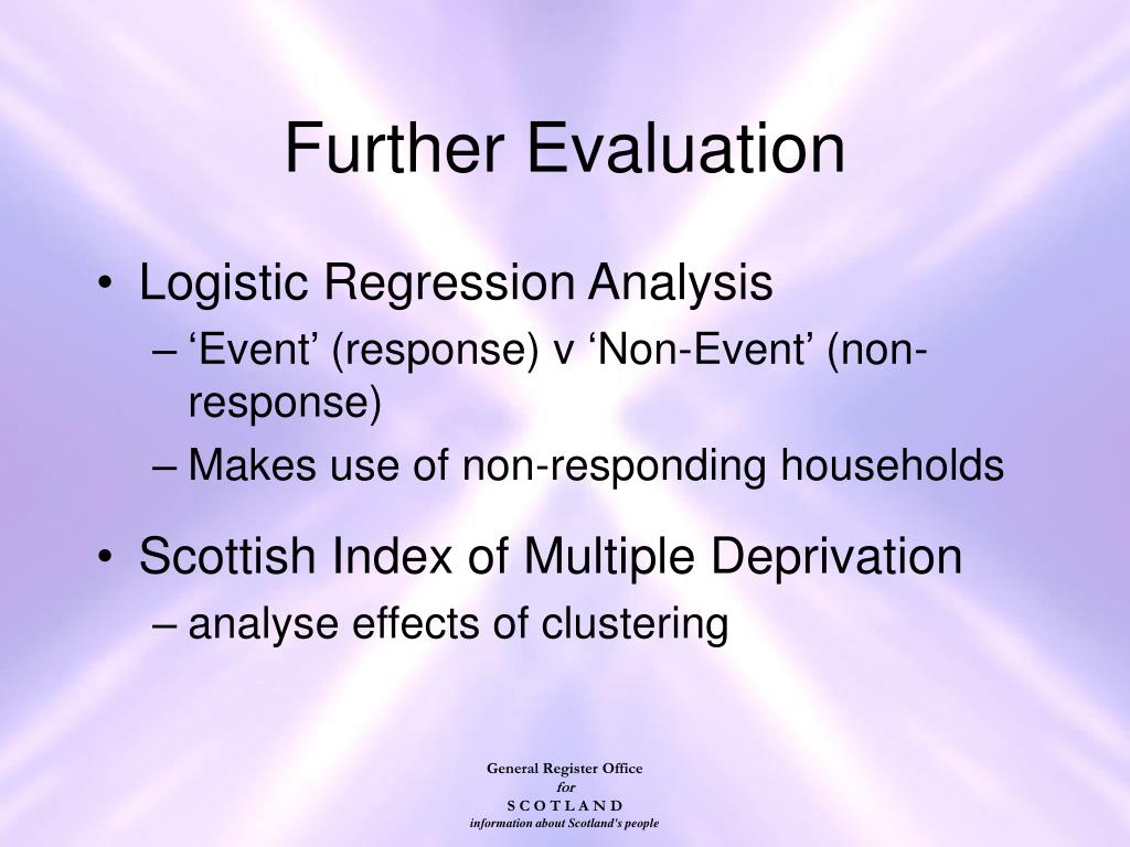 Further Evaluation • Logistic Regression Analysis • ‘Event’ (response) v ‘Non-Event’ (non-response) • Makes use of non-responding households • Scottish Index of Multiple Deprivation • analyse effects of clustering