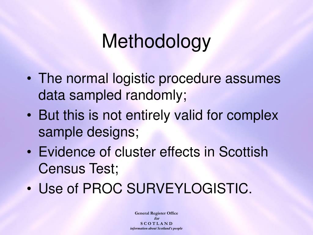 Methodology • The normal logistic procedure assumes data sampled randomly; • But this is not entirely valid for complex sample designs; • Evidence of cluster effects in Scottish Census Test; • Use of PROC SURVEYLOGISTIC.