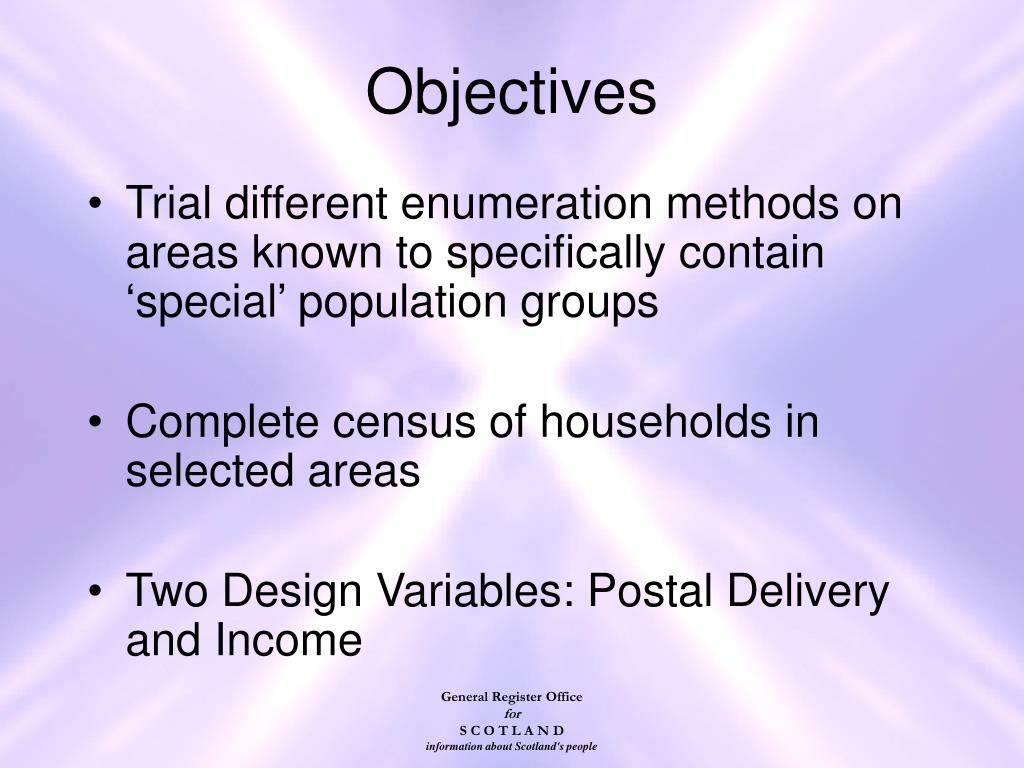 Objectives • Trial different enumeration methods on areas known to specifically contain ‘special’ population groups • Complete census of households in selected areas • Two Design Variables: Postal Delivery and Income