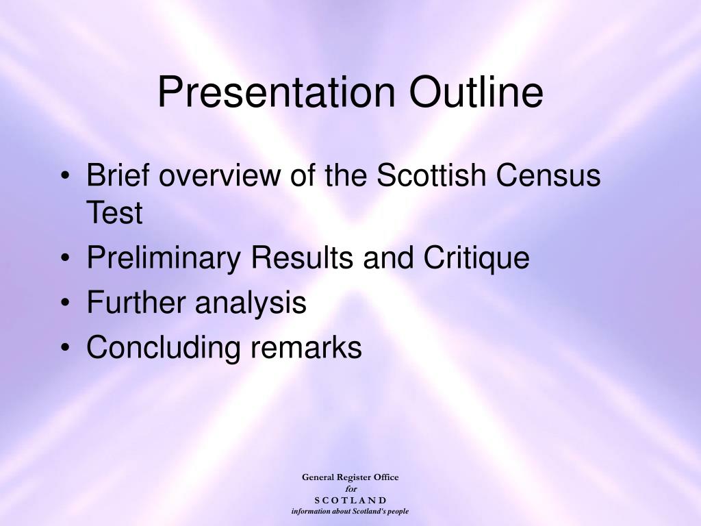 Presentation Outline • Brief overview of the Scottish Census Test • Preliminary Results and Critique • Further analysis • Concluding remarks