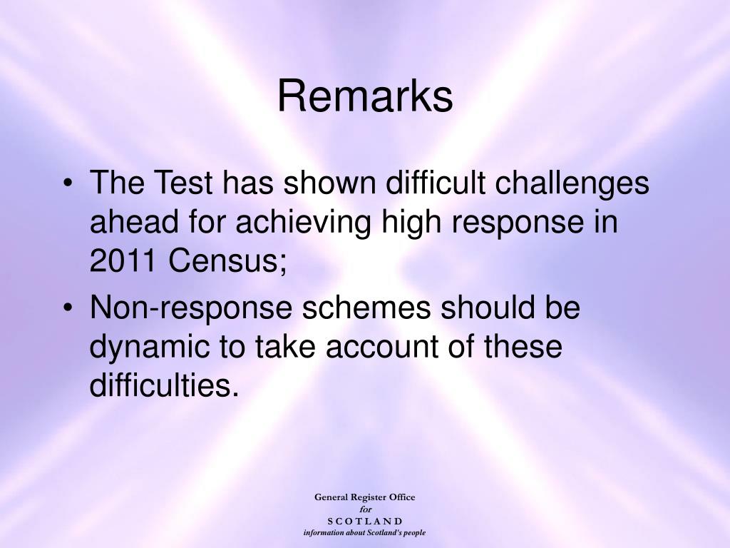 Remarks • The Test has shown difficult challenges ahead for achieving high response in 2011 Census; • Non-response schemes should be dynamic to take account of these difficulties.