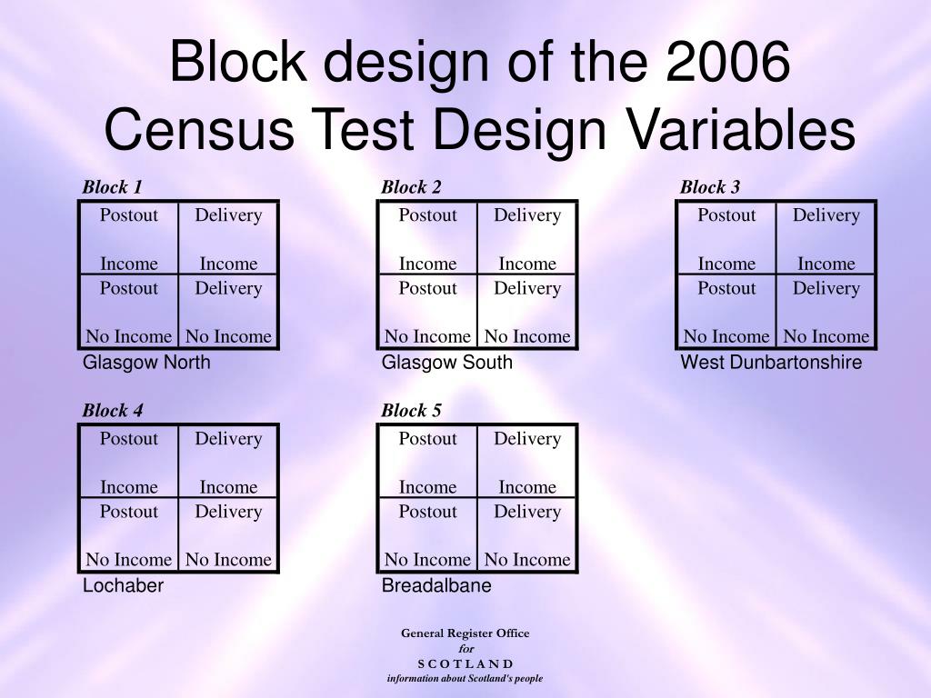 Block 1 Block 2 Block 3 Postout Delivery Postout Delivery Postout Delivery Income Income Income Income Income Income Postout Delivery Postout Delivery Postout Delivery No Income No Income No Income No Income No Income No Income Glasgow North Glasgow South West Dunbartonshire Block 4 Block 5 Postout Delivery Postout Delivery Income Income Income Income Postout Delivery Postout Delivery No Income No Income No Income No Income Lochaber Breadalbane Block design of the 2006 Census Test Design Variables