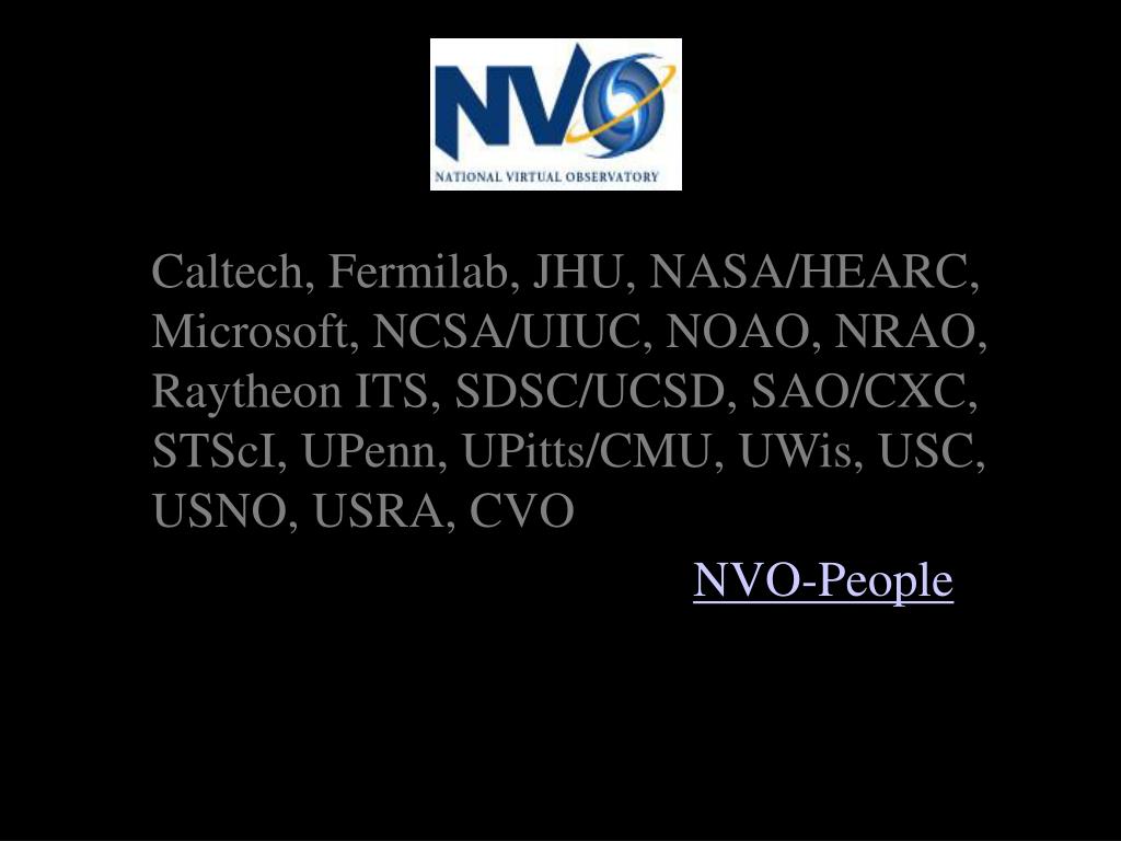 Caltech, Fermilab, JHU, NASA/HEARC, Microsoft, NCSA/UIUC, NOAO, NRAO, Raytheon ITS, SDSC/UCSD, SAO/CXC, STScI, UPenn, UPitts/CMU, UWis, USC, USNO, USRA, CVO NVO-People