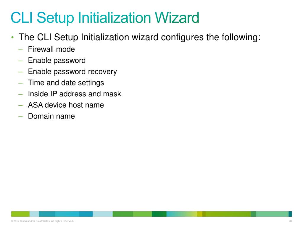 CLI Setup Initialization Wizard • The CLI Setup Initialization wizard configures the following: • Firewall mode • Enable password • Enable password recovery • Time and date settings • Inside IP address and mask • ASA device host name • Domain name