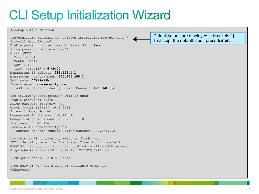CLI Setup Initialization Wizard • <Bootup output omitted> • Pre-configure Firewall now through interactive prompts [yes]? • Firewall Mode [Routed]: • Enable password [<use current password>]: cisco • Allow password recovery [yes]? • Clock (UTC): • Year [2012]: • Month [Oct]: • Day [3]: • Time [03:44:47]: 6:49:00 • Management IP address: 192.168.1.1 • Management network mask: 255.255.255.0 • Host name: CCNAS-ASA • Domain name: ccnasecurity.com • IP address of host running Device Manager: 192.168.1.2 • The following configuration will be used: • Enable password: cisco • Allow password recovery: yes • Clock (UTC): 6:49:00 Oct 3 2011 • Firewall Mode: Routed • Management IP address: 192.168.1.1 • Management network mask: 255.255.255.0 • Host name: CCNAS-ASA • Domain name: ccnasecurity.com • IP address of host running Device Manager: 192.168.1.2 • Use this configuration and write to flash? yes • INFO: Security level for "management" set to 0 by default. • WARNING: http server is not yet enabled to allow ASDM access. • Cryptochecksum: ba17fd17 c28f2342 f92f2975 1e1e5112 • 2070 bytes copied in 0.910 secs • Type help or '?' for a list of available commands. • CCNAS-ASA> Default values are displayed in brackets [ ]. To accept the default input, press Enter.