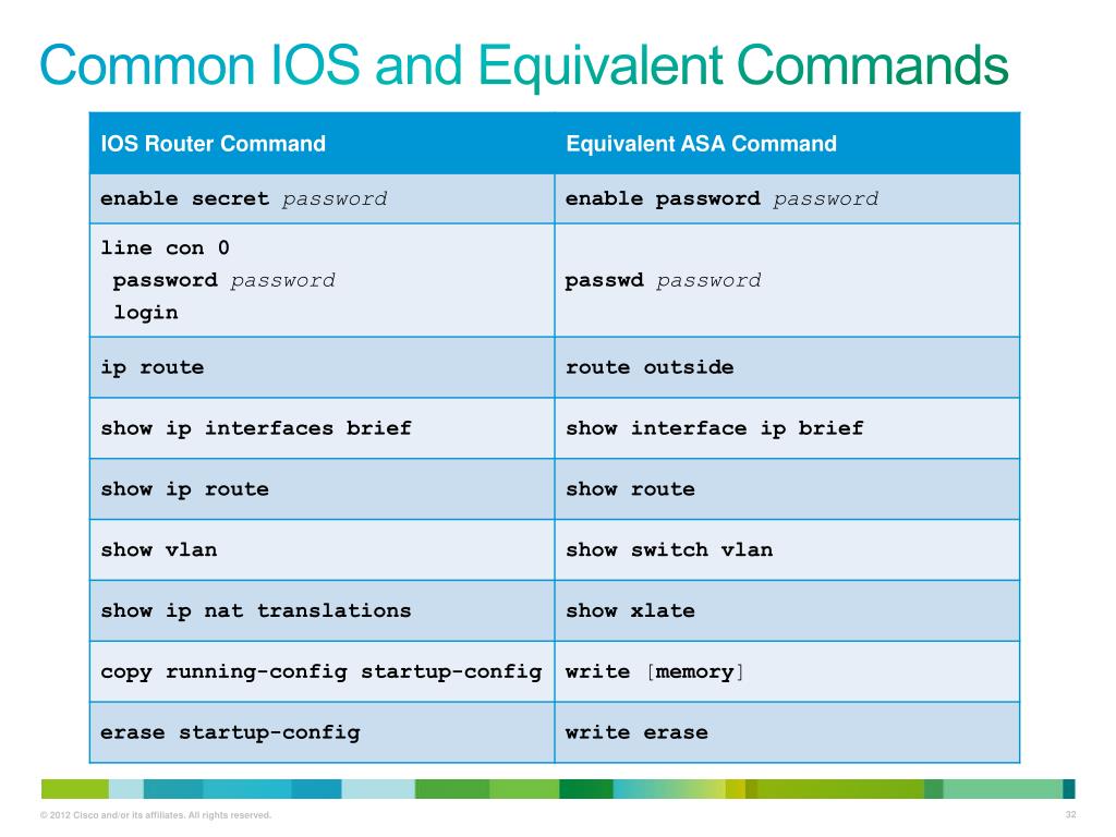 ASA Command Line Interface (CLI) • The ASA CLI is a proprietary OS which has a similar look and feel to the router IOS. • Like a Cisco IOS router, the ASA recognizes the following: • Abbreviation of commands and keywords. • Using the Tab key to complete a partial command. • Using the help key (?) after a command to view additional syntax. • Unlike an ISR, the ASA: • Can execute any ASA CLI command regardless of the current configuration mode prompt and does not require or recognize the do IOS CLI command. • Can provide additional help listing a brief command description and syntax by using the EXEC command help followed by the CLI command. (e.g., helpreload) • Interrupts show command output by simply using the letter Q.(Unlike the Ctrl+C (^C) IOS CLI key sequence.)