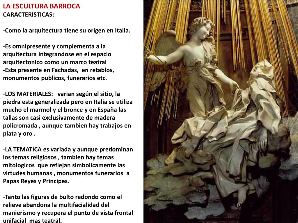 LA ESCULTURA BARROCA. Inma . Navarro. LA ESCULTURA BARROCA CARACTERISTICAS : -Como la arquitectura tiene su origen en Italia . Es omnipresente y complementa a la arquitectura integrandose en el espacio arquitectonico como un marco teatral