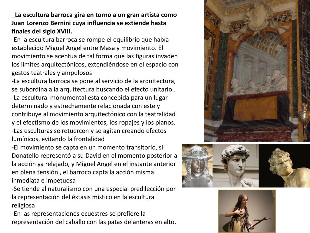_La escultura barroca gira en torno a un gran artista como Juan Lorenzo Bernini cuya influencia se extiende hasta finales del siglo XVIII. • -En la escultura barroca se rompe el equilibrio que había establecido Miguel Angel entre Masa y movimiento. El movimiento se acentua de tal forma que las figuras invaden los límites arquitectónicos, extendiéndose en el espacio con gestos teatrales y ampulosos • -La escultura barroca se pone al servicio de la arquitectura, se subordina a la arquitectura buscando el efecto unitario.. • -La escultura monumental esta concebida para un lugar determinado y estrechamente relacionada con este y contribuye al movimiento arquitectónico con la teatralidad y el efectismo de los movimientos, los ropajes y los planos. • -Las esculturas se retuercen y se agitan creando efectos lumínicos, evitando la frontalidad • -El movimiento se capta en un momento transitorio, si Donatello representó a su David en el momento posterior a la acción ya relajado, y Miguel Angel en el instante anterior en plena tensión , el barroco capta la acción misma inmediata e impetuosa • -Se tiende al naturalismo con una especial predilección por la representación del éxtasis místico en la escultura religiosa • -En las representaciones ecuestres se prefiere la representación del caballo con las patas delanteras en alto.