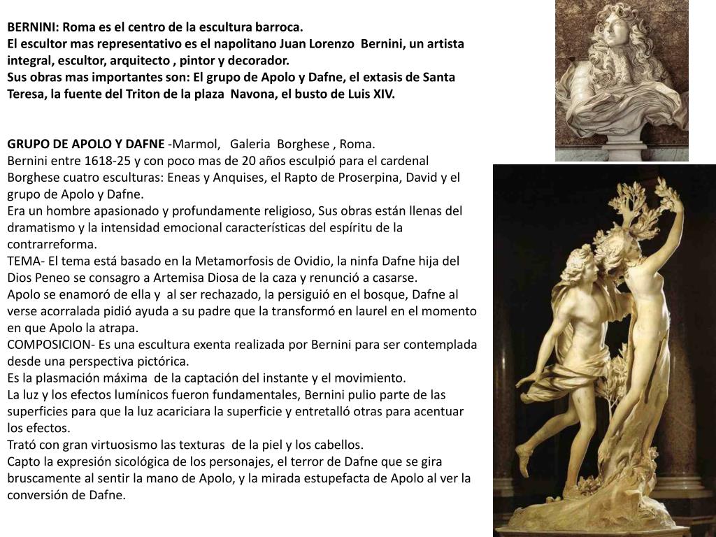 BERNINI: Roma es el centro de la escultura barroca. El escultor mas representativo es el napolitano Juan Lorenzo Bernini, un artista integral, escultor, arquitecto , pintor y decorador. Sus obras mas importantes son: El grupo de Apolo y Dafne, el extasis de Santa Teresa, la fuente del Triton de la plaza Navona, el busto de Luis XIV. GRUPO DE APOLO Y DAFNE -Marmol, GaleriaBorghese , Roma. Bernini entre 1618-25 y con poco mas de 20 años esculpió para el cardenal Borghese cuatro esculturas: Eneas y Anquises, el Rapto de Proserpina, David y el grupo de Apolo y Dafne. Era un hombre apasionado y profundamente religioso, Sus obras están llenas del dramatismo y la intensidad emocional características del espíritu de la contrarreforma. TEMA- El tema está basado en la Metamorfosis de Ovidio, la ninfa Dafne hija del Dios Peneo se consagro a Artemisa Diosa de la caza y renunció a casarse. Apolo se enamoró de ella y al ser rechazado, la persiguió en el bosque, Dafne al verse acorralada pidió ayuda a su padre que la transformó en laurel en el momento en que Apolo la atrapa. COMPOSICION- Es una escultura exenta realizada por Bernini para ser contemplada desde una perspectiva pictórica. Es la plasmación máxima de la captación del instante y el movimiento. La luz y los efectos lumínicos fueron fundamentales, Berninipulio parte de las superficies para que la luz acariciara la superficie y entretalló otras para acentuar los efectos. Trató con gran virtuosismo las texturas de la piel y los cabellos. Capto la expresión sicológica de los personajes, el terror de Dafne que se gira bruscamente al sentir la mano de Apolo, y la mirada estupefacta de Apolo al ver la conversión de Dafne.