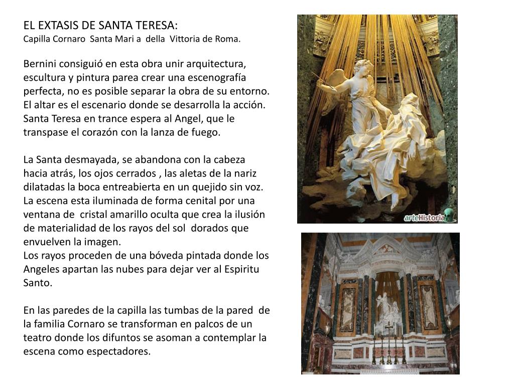 EL EXTASIS DE SANTA TERESA: Capilla Cornaro Santa Mari a dellaVittoria de Roma. Bernini consiguió en esta obra unir arquitectura, escultura y pintura parea crear una escenografía perfecta, no es posible separar la obra de su entorno. El altar es el escenario donde se desarrolla la acción. Santa Teresa en trance espera al Angel, que le transpaseel corazón con la lanza de fuego. La Santa desmayada, se abandona con la cabeza hacia atrás, los ojos cerrados , las aletas de la nariz dilatadas la boca entreabierta en un quejido sin voz. La escena esta iluminada de forma cenital por una ventana de cristal amarillo oculta que crea la ilusión de materialidad de los rayos del sol dorados que envuelven la imagen. Los rayos proceden de una bóveda pintada donde los Angelesapartan las nubes para dejar ver al Espiritu Santo. En las paredes de la capilla las tumbas de la pared de la familia Cornaro se transforman en palcos de un teatro donde los difuntos se asoman a contemplar la escena como espectadores.