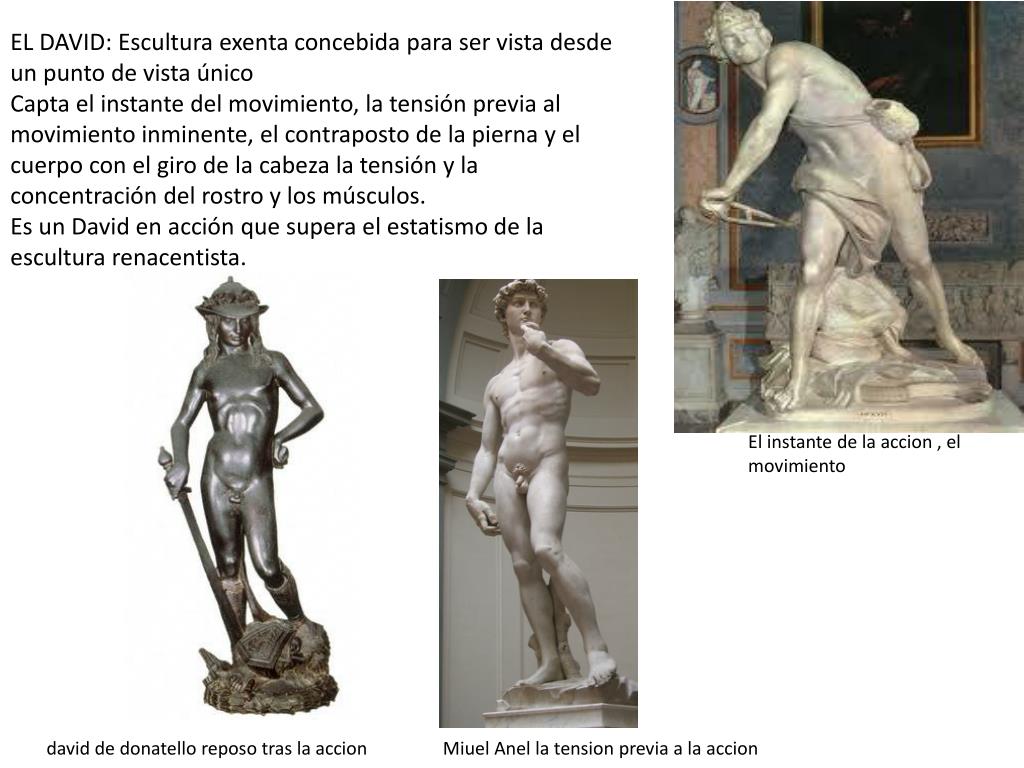 EL DAVID: Escultura exenta concebida para ser vista desde un punto de vista único Capta el instante del movimiento, la tensión previa al movimiento inminente, el contraposto de la pierna y el cuerpo con el giro de la cabeza la tensión y la concentración del rostro y los músculos. Es un David en acción que supera el estatismo de la escultura renacentista. El instante de la accion , el movimiento david de donatello reposo tras la accionMiuelAnel la tension previa a la accion