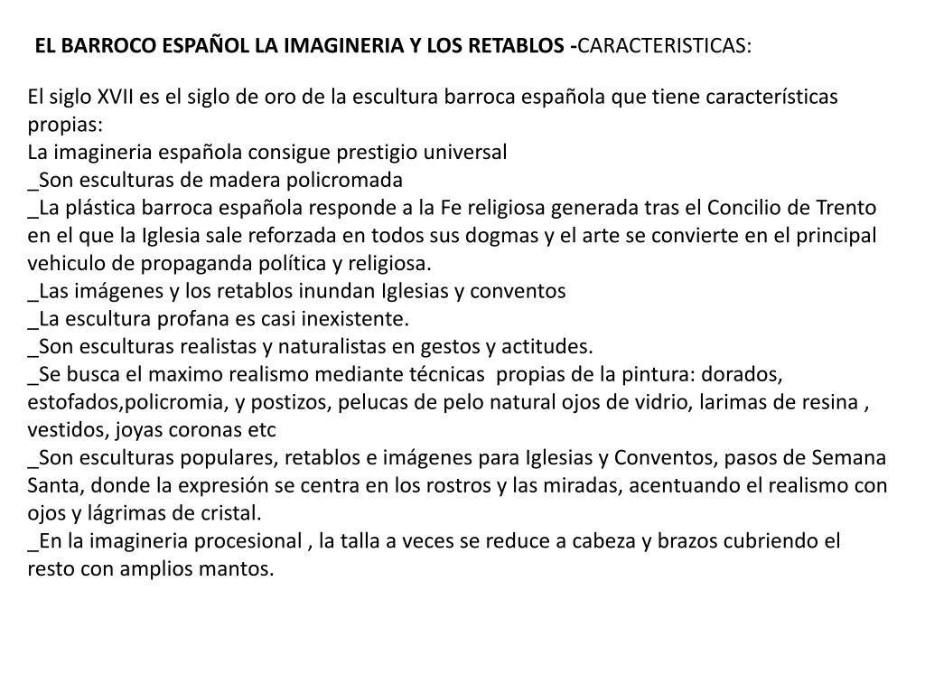 EL BARROCO ESPAÑOL LA IMAGINERIA Y LOS RETABLOS -CARACTERISTICAS: • El siglo XVII es el siglo de oro de la escultura barroca española que tiene características propias: • La imagineria española consigue prestigio universal • _Son esculturas de madera policromada • _La plástica barroca española responde a la Fe religiosa generada tras el Concilio de Trento en el que la Iglesia sale reforzada en todos sus dogmas y el arte se convierte en el principal vehiculo de propaganda política y religiosa. • _Las imágenes y los retablos inundan Iglesias y conventos • _La escultura profana es casi inexistente. • _Son esculturas realistas y naturalistas en gestos y actitudes. • _Se busca el maximo realismo mediante técnicas propias de la pintura: dorados, estofados,policromia, y postizos, pelucas de pelo natural ojos de vidrio, larimas de resina , vestidos, joyas coronas etc • _Son esculturas populares, retablos e imágenes para Iglesias y Conventos, pasos de Semana Santa, donde la expresión se centra en los rostros y las miradas, acentuando el realismo con ojos y lágrimas de cristal. • _En la imagineria procesional , la talla a veces se reduce a cabeza y brazos cubriendo el resto con amplios mantos.